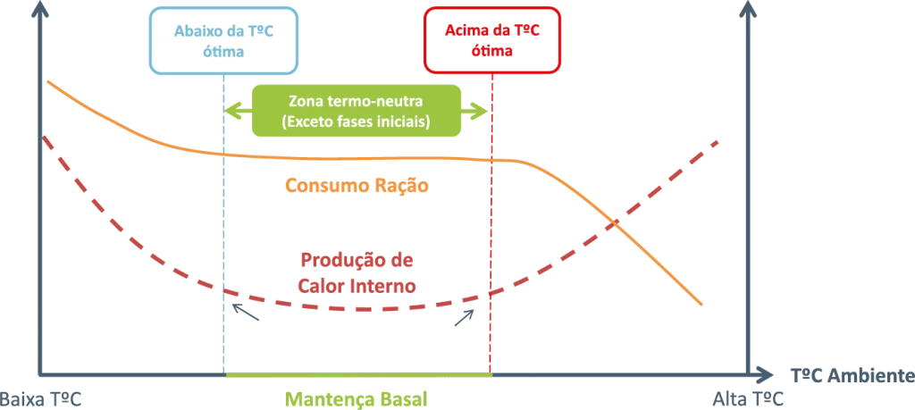 Quando os limites de termoneutralidade são ultrapassados, o primeiro efeito observado é a redução no consumo de alimento e aumento no consumo de água, acompanhado do aumento da ofegação e tem por objetivo manter a temperatura corporal, diminuindo a produção de calor interno (Fig. 1)